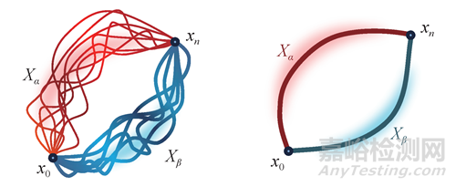 圖5 一個(gè)粒子從t0時(shí)刻處在x0位置出發(fā),經(jīng)過(guò)不同路徑在tn時(shí)刻處在xn位置。左圖和右圖分別代表細(xì)粒化和粗?;穆窂?/span>