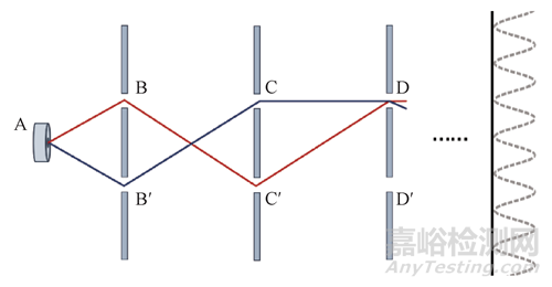 圖6 粒子通過(guò)不同的雙縫將經(jīng)歷不同的“歷史”,如A-B-C’-D(紅色路徑)或A-B’-C-D(藍(lán)色路徑),它們是相干的