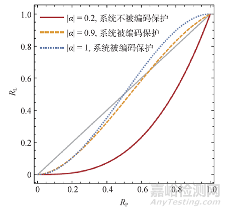 我們的工作還給出了量子系統(tǒng)結(jié)構(gòu)函數(shù)的明確描述方式。在量子系統(tǒng)內(nèi)部,量子部件狀態(tài)之間的量子糾纏是經(jīng)典系統(tǒng)內(nèi)經(jīng)典部件所沒(méi)有的獨(dú)特特征,這一特征也會(huì)改變系統(tǒng)的結(jié)構(gòu)函數(shù),進(jìn)而影響系統(tǒng)可靠性。例如,用三比特翻轉(zhuǎn)碼保護(hù)的量子存儲(chǔ):三個(gè)物理比特即為系統(tǒng)的三個(gè)部件,所保護(hù)的邏輯比特是系統(tǒng)的整體狀態(tài)。當(dāng)儲(chǔ)存的邏輯比特是無(wú)相干性的態(tài)時(shí),系統(tǒng)的結(jié)構(gòu)函數(shù)是經(jīng)典可靠性中常見(jiàn)的一種,即如果三個(gè)部件有兩個(gè)以上可靠,那么系統(tǒng)可靠。而當(dāng)儲(chǔ)存的邏輯比特是疊加態(tài)時(shí),需要在物理比特之間引入糾纏。此時(shí),系統(tǒng)的結(jié)構(gòu)函數(shù)無(wú)法再用經(jīng)典可靠性理論描寫(xiě)。圖7繪制了系統(tǒng)可靠度(RL)與部件可靠度(RP)的依賴關(guān)系,可以看出,當(dāng)改變系統(tǒng)初始狀態(tài)即部件之間的糾纏時(shí),閾值(曲線和對(duì)角線的交點(diǎn))會(huì)發(fā)生相應(yīng)的改變。這表明部件之間量子糾纏會(huì)改變系統(tǒng)結(jié)構(gòu)函數(shù)進(jìn)而影響閾值的大小。其中,越小的閾值表示這種冗余結(jié)構(gòu)對(duì)系統(tǒng)的保護(hù)越好,當(dāng)閾值等于1的時(shí)候這種冗余結(jié)構(gòu)完全無(wú)法保護(hù)系統(tǒng)。