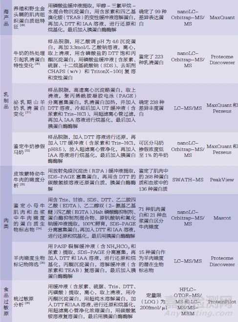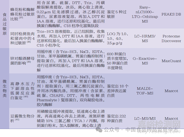 蛋白質(zhì)組學(xué)技術(shù)的發(fā)展為食品相關(guān)研究打開(kāi)了新思路,不僅可以用于蛋白質(zhì)種類(lèi)鑒定,還可用于蛋白質(zhì)含量檢測(cè),以及分析不同物種、產(chǎn)地、生長(zhǎng)階段的食品蛋白質(zhì)組分和食品加工過(guò)程蛋白質(zhì)組變化等。目前,蛋白質(zhì)組學(xué)技術(shù)已在食品的諸多品類(lèi)中有應(yīng)用,如農(nóng)產(chǎn)品、海產(chǎn)品、乳制品、肉類(lèi)、微生物類(lèi)以及食品過(guò)敏原等(表2)。
