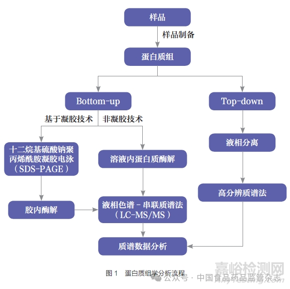 蛋白質(zhì)組學(xué)中基于質(zhì)譜的分析方法是食品質(zhì)量分析領(lǐng)域中發(fā)展較快的方法, 研究流程分為Bottom-up 型和Top-down型。前者又稱(chēng)為鳥(niǎo)槍法,該技術(shù)流程一般分為以下幾步:樣品制備,即從樣品中分離凈化目標(biāo)物;蛋白質(zhì)酶解,將蛋白質(zhì)酶解為肽段;利用色譜技術(shù)對(duì)肽段進(jìn)行分離,隨后進(jìn)入質(zhì)譜檢測(cè)。相較于Bottom-up 技術(shù),Top-down 技術(shù)的不同之處在于蛋白質(zhì)未經(jīng)酶解直接進(jìn)入質(zhì)譜,直接被裂解為肽段進(jìn)行分析。該方法成本高,目前應(yīng)用較少。蛋白質(zhì)組學(xué)分析流程見(jiàn)圖1。