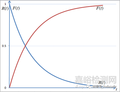 眾所周知,R(t)與F(t)是一對互補的函數(shù),即R(t)+F(t)=1。因為在開始工作時, 沒有任何產(chǎn)品出現(xiàn)問題,即R(0)=1,F(0)=0。隨著時間的增加,失效數(shù)也不斷增加,可靠性也相應減小。下圖反應了R(t)與F(t)隨時間的曲線變化: