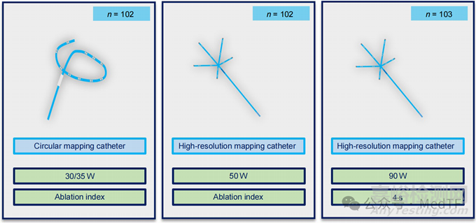 本項(xiàng)研究評(píng)估了三種功率射頻能量:第一組30/35W(標(biāo)測(cè)導(dǎo)管:Lasso Nav,射頻導(dǎo)管:ThermoCool SmartTouch SF)(n=102),第二組50W(多級(jí)標(biāo)測(cè)導(dǎo)管:Pentaray,射頻導(dǎo)管ThermoCool SmartTouch SF)(n=102),第三組90W(多級(jí)標(biāo)測(cè)導(dǎo)管:Pentaray,射頻導(dǎo)管QDOT MICRO)(n=103)。