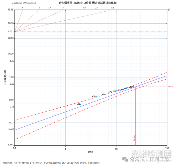 當(dāng)然,我們可以通過Weibull分析進一步確認(rèn)產(chǎn)品是不是在早夭期,我們可以將前面24小時的失效數(shù)據(jù)做一個Weibull分析,其結(jié)果如下: