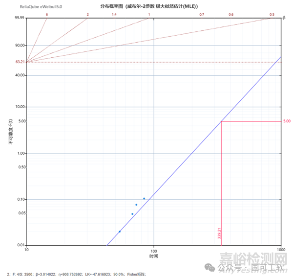 其中計算得到的β=3,遠(yuǎn)大于1。從曲線來看,5%失效的時間大概是340多小時。這時候我們必須對失效的樣品進行分析,通常失效時由于某一特定的元器件缺陷造成的,而這種缺陷很可能導(dǎo)致產(chǎn)品短期內(nèi)達(dá)到疲勞失效時間點而導(dǎo)致失效。而那些沒有這種缺陷的產(chǎn)品不會出現(xiàn)疲勞失效,在這個失效概率分布曲線上,可能存在著兩個分布,一個是由于早期疲勞導(dǎo)致的失效分布,另外一個是正常的失效分布曲線。要確認(rèn)這一點,我們需要對失效進行分析,了解失效的機理,判斷是不是由于設(shè)計或者器件缺陷及生產(chǎn)流程導(dǎo)致的缺陷。同時可以延長一定的測試時間,觀察產(chǎn)品失效的分布,是不是在某個時間點出現(xiàn)拐點,這樣才能夠確認(rèn)產(chǎn)品早期疲勞失效的結(jié)束時間點。
