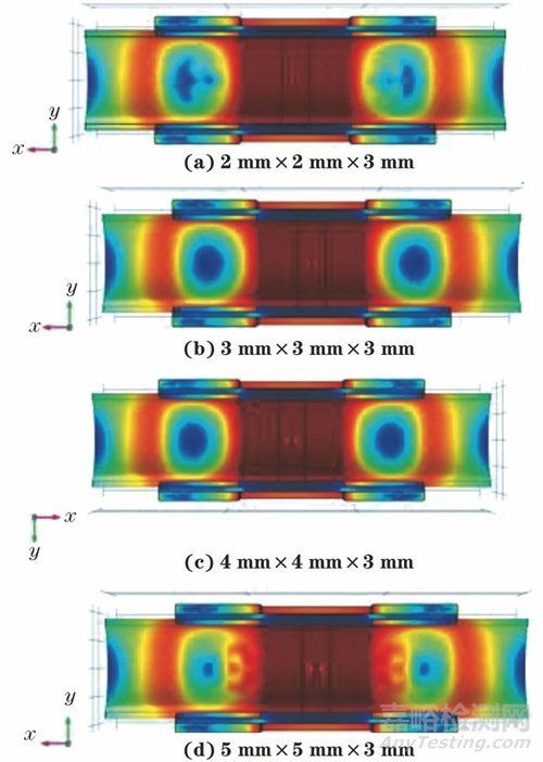 針對(duì)水冷壁管較為常見的腐蝕缺陷,在有限元仿真分析軟件中建立水冷壁管模型,在管道內(nèi)側(cè)的正中位置分別設(shè)置深度固定為3 mm、尺寸為2 mm×2 mm,3 mm×3 mm,4 mm×4 mm,5 mm×5 mm的矩形缺陷,分別分析有無鰭片水冷壁管不同尺寸內(nèi)缺陷的漏磁場空間分布狀況。