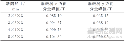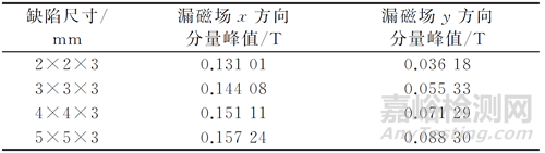 表1 無鰭片不同尺寸缺陷漏磁場磁通量密度x,y方向分量峰值