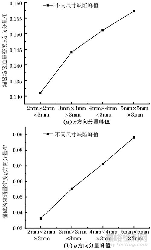 不同尺寸缺陷的漏磁場磁通量密度x,y方向分量峰值如表2所示,繪制成折線圖如圖8所示。