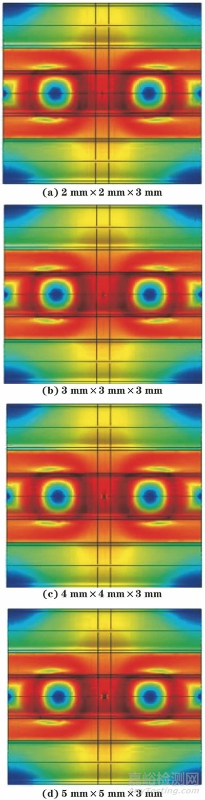 圖5 無鰭片不同尺寸缺陷三維體磁通密度剖面云圖