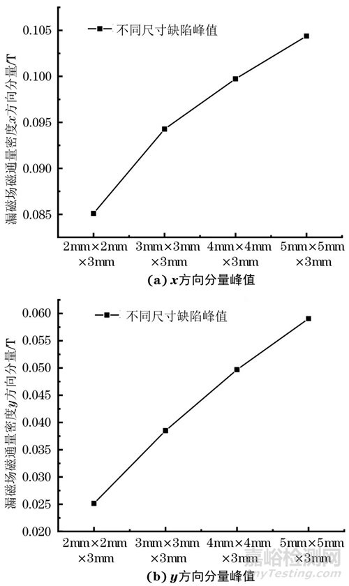 不同尺寸缺陷的漏磁場磁通量密度x,y方向分量峰值如表1所示,繪制成折線圖如圖6所示。