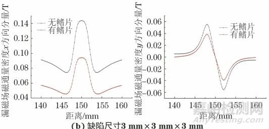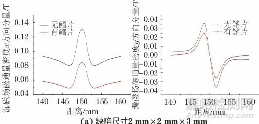 由圖9可知,由于鰭片的存在,一部分磁場由鰭片處通過,使磁化強(qiáng)度減弱,缺陷處的漏磁場亦減弱。每個(gè)尺寸缺陷處漏磁場磁通量密度x方向分量均整體減小,y方向分量波動(dòng)程度減小,即鰭片的存在會(huì)分散一部分磁場,使磁化強(qiáng)度減弱,缺陷處漏磁場強(qiáng)度變小。