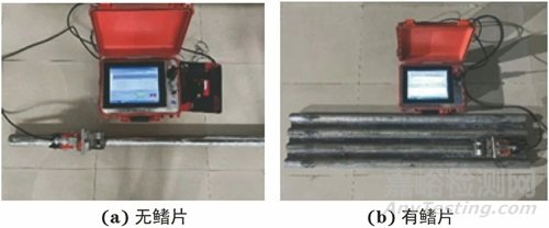 在實(shí)驗(yàn)室搭建試驗(yàn)平臺(tái),設(shè)置預(yù)置試驗(yàn)板,材料選擇鍋爐水冷壁管專用材料20G,鍋爐水冷壁管尺寸同上述尺寸。選用OMPS-08型漏磁檢測儀進(jìn)行檢測,試驗(yàn)現(xiàn)場如圖10所示。試驗(yàn)內(nèi)容為分析不同尺寸和不同位置角度缺陷的漏磁場特征量分布情況。