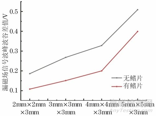 圖12 有無鰭片不同尺寸缺陷漏磁信號(hào)波峰波谷差值折線圖