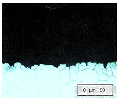 在進(jìn)行空氣退火時(shí),為了去除氧化皮和貧鉻層,必須要進(jìn)行酸洗。由于鋼管內(nèi)徑非常小,鋼管很長(zhǎng),在鋼管表面很難進(jìn)行該操作。酸洗條件不好時(shí),不是不能完全去除貧鉻層就是造成過(guò)酸洗,如圖9所示。過(guò)酸洗會(huì)使表面變粗糙,增大壓降。上述生產(chǎn)工藝采用光亮退火避免了這些風(fēng)險(xiǎn),由于不進(jìn)行酸洗,同時(shí)對(duì)環(huán)境友好(不產(chǎn)生含氮化物的廢液),使用安全(無(wú)HF酸)。