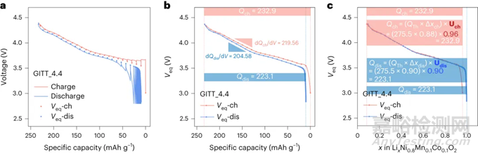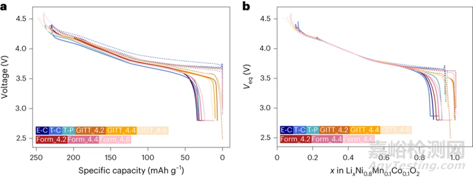 圖1反映了不同的高鎳正極材料、電解液、裝配方式、截止電壓的電池測(cè)試,呈現(xiàn)出多種的衰減情況。當(dāng)使用平衡電勢(shì)Veq對(duì)活性鋰含量x (LixNi0.8Mn0.1Co0.1O2)作圖時(shí),則能夠呈現(xiàn)明確的規(guī)律。平衡電勢(shì)Veq去除了極化電壓的影響,與鋰含量x的關(guān)系符合吉布斯自由能定律,可以通過(guò)恒流間歇滴定(GITT)判斷。