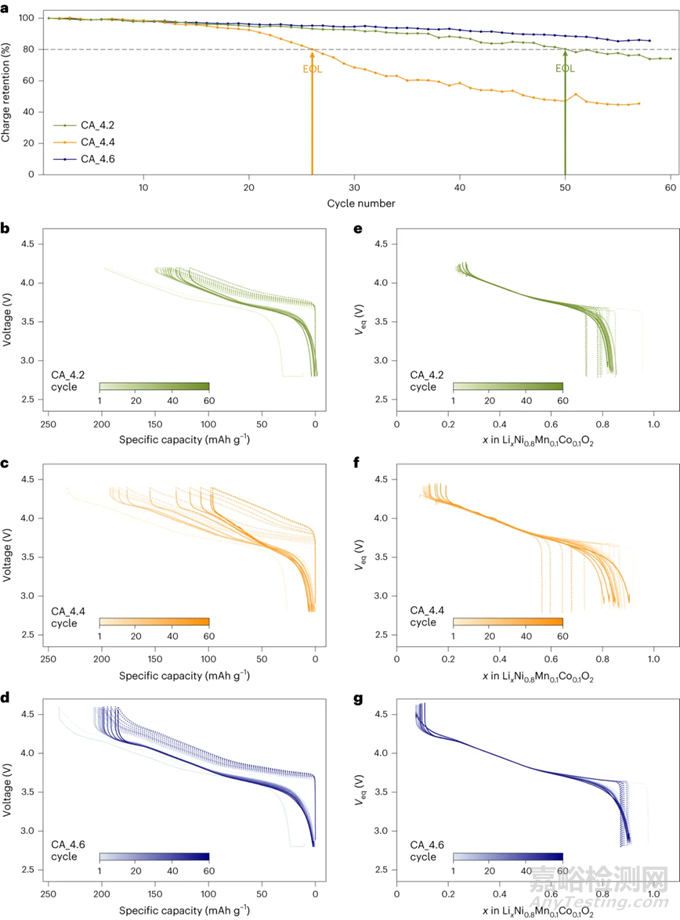 圖3 截止電壓在4.2V、4.4V、4.6V的循環(huán)曲線。(a) 電荷保持曲線;(b-d) 不同截止電壓的電池在循環(huán)老化中的實(shí)驗(yàn)V與Q曲線;(e-g) 循環(huán)老化過(guò)程中相應(yīng)Veq與x曲線
