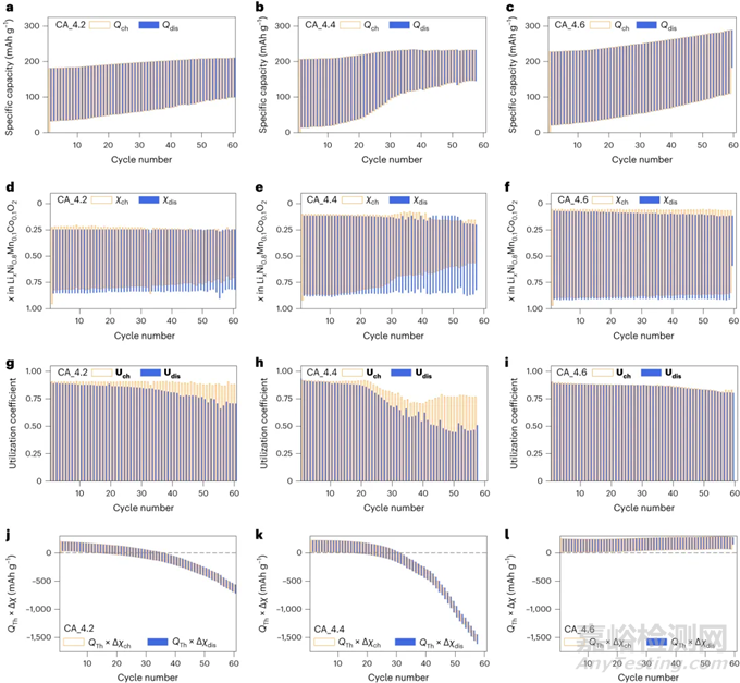 圖4 追蹤截止電壓在4.2 V、4.4 V、4.6 V的電池在循環(huán)老化中關(guān)鍵變量的變化。每一列代表不同截止電壓:(a-c) 比容量與循環(huán)圈數(shù)變化;(d-f) 鋰含量(x)隨循環(huán)數(shù)變化;(g-i) 利用率U隨循環(huán)數(shù)的變化;(j-l) 理論容量和鋰含量差值的乘積(QTh×Δx)隨循環(huán)數(shù)的變化