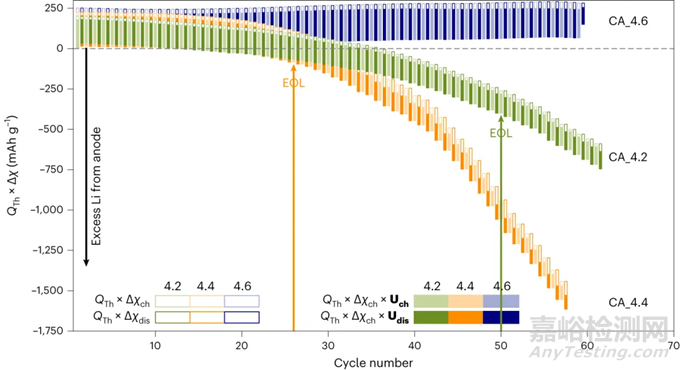 如圖5所示,截止電壓4.2 V的電池在循環(huán)50圈后達(dá)到壽命終止(80%容量),(QTh×Δx)所示負(fù)極提供的鋰在-250 mAh·g-1至-400 mAh·g-1范圍內(nèi)?;钚凿嚨膿p失是循環(huán)壽命的決定因素,截止電壓4.4 V的電池在26圈即達(dá)到80%容量,即使Li含量余額仍處于第二階段,但Uch(~0.85)和Udis(~0.76)明顯下降。在截止電壓4.6 V中,鋰含量余額始終維持在階段1。