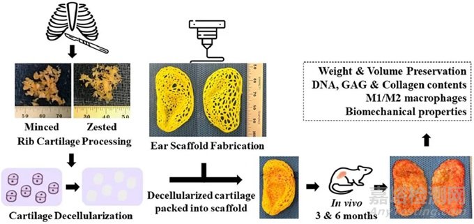 人體耳廓的精確重建一直是整形外科醫(yī)生面臨的巨大挑戰(zhàn)。在本文中,研究人員利用脫細(xì)胞軟骨異種移植物進(jìn)行了生物工程全尺寸耳朵,將其放置在 3D 打印的外部耳廓支架內(nèi),模仿天然人類耳廓的大小、形狀和生物力學(xué)特性。對(duì)具有更快降解生物材料的新耳進(jìn)行長(zhǎng)期研究將有利于未來(lái)的臨床應(yīng)用。該項(xiàng)研究為那些先天性畸形或晚年失去耳朵的人提供了具有明確解剖結(jié)構(gòu)和正確生物力學(xué)特性的移植物的前景。