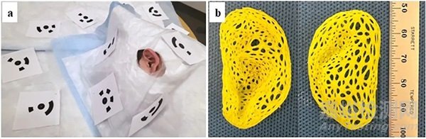 圖2:a. 25 歲男性志愿者左耳的三維攝影測(cè)量; b. 植入前3D打印的PLA耳支架的代表性圖像。