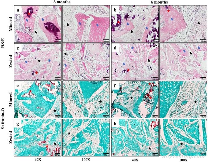 圖4:耳支架在小鼠體內(nèi)3個(gè)月和6個(gè)月后的代表性圖像。a-d:第3個(gè)月和第6個(gè)月時(shí),觀察到軟骨片(藍(lán)色箭頭)之間存在大量細(xì)胞浸潤(rùn)(黑色箭頭);e-h:在各個(gè)軟骨片之間觀察到染色切片中大量的膠原蛋白沉積(黑色星號(hào));通過(guò)脫細(xì)胞過(guò)程,軟骨中的糖胺聚糖大部分被耗盡,在軟骨片之間的纖維血管浸潤(rùn)中發(fā)現(xiàn)膠原沉積。在一些軟骨片(紅色星號(hào))中觀察到鈣化軟骨基質(zhì)的微觀區(qū)域。