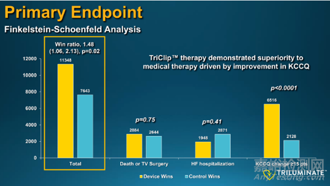 主要終點(diǎn):主要復(fù)合終點(diǎn)的分層分析表明,TEER組優(yōu)于對照組,勝率為1.48(95%CI 1.06-2.13,P=0.02);