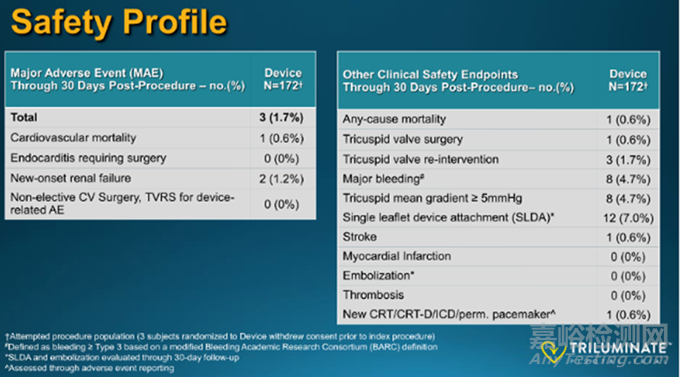 療效:86%患者的三尖瓣反流嚴(yán)重程度至少降低了1級,達(dá)到預(yù)先設(shè)定的療效終點(diǎn);