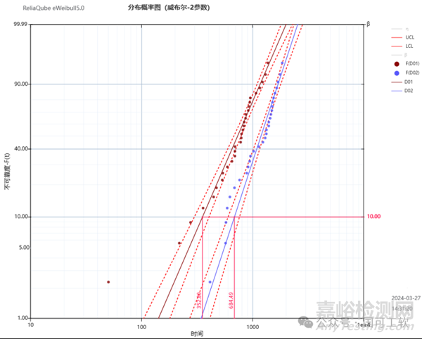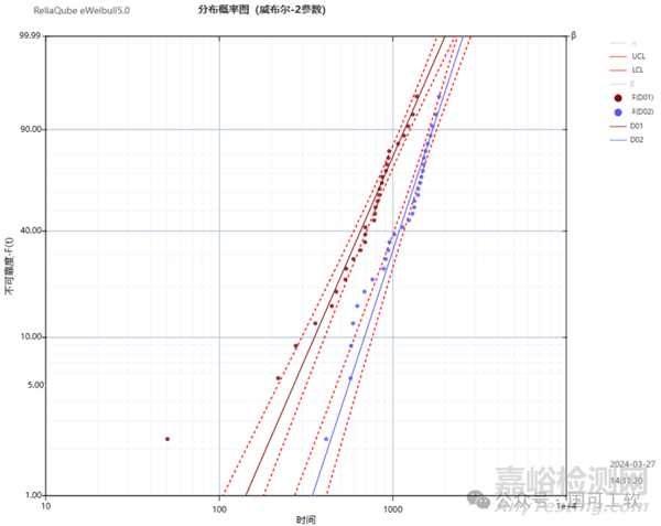 這些置信上下限是90%的雙側置信區(qū)間。它們可以直接從威布爾圖中讀取,也可以從eWeibull軟件中獲得.