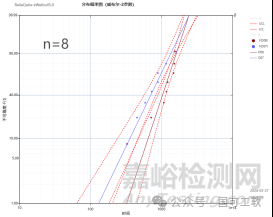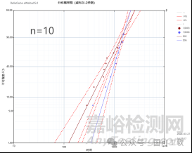 在圖5中,當樣本量下降到10、8或6時,重疊變得更加嚴重。這是可以解釋的,因為樣本量越小,置信區(qū)間就越寬,尤其是在極低的失效概率情況下。