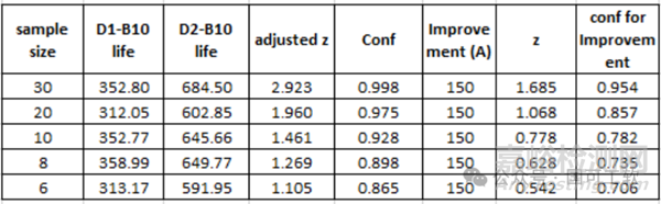 例如,在開發(fā)的早期,工程師只有約8個部件來執(zhí)行可靠性測試。很快,可靠性測試產生了失效,工程師得出了可靠性水平太低的結論。在設計變更后,工程師再次進行了相同的可靠性測試,假設這次有10個部件,失效時間似乎比上一代設計更長,那么工程師該如何知道所觀察到的改進是真正的改進,而不是偶然的測試結果?