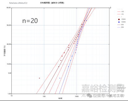 圖4顯示了樣本量n=30和n=20時的視覺對比。我們觀察到,當n=20時,兩條威布爾置信曲線在10%累積失效概率水平線開始重疊。