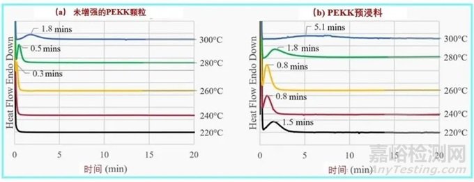 ((a)未增強(qiáng)的 PEKK 粉末和(b)CF/PEKK 預(yù)浸料帶在不同溫度下進(jìn)行等溫保持時(shí)的 DSC 熱譜圖,顯示峰值結(jié)晶動(dòng)力學(xué)時(shí)間(分鐘)。在(a)中,經(jīng)歷 220 和 240°C 等溫線的樣品在達(dá)到等溫溫度之前結(jié)晶,因此在等溫保持期間沒(méi)有顯示結(jié)晶峰。在(b)中,在 240 和 260°C 之間可以觀察到最快的結(jié)晶動(dòng)力學(xué))