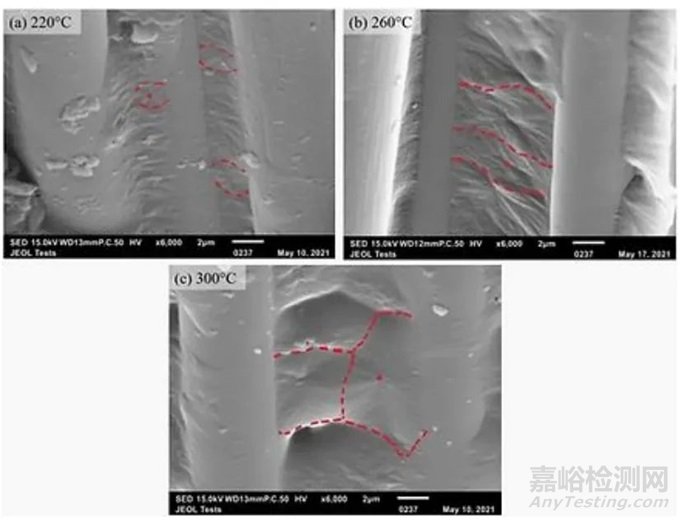 (從熔體中經(jīng)歷(a)220°C、(b)260°C 和(C)300°C的等溫保溫后,低溫?cái)嗔训?CF/PEKK 樣品的 SEM。紅色注釋突出顯示球晶結(jié)構(gòu),紅點(diǎn)提供了細(xì)胞核位置的示例。)