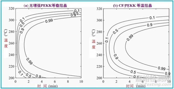 ((a)未增強(qiáng) PEKK 和(b)CF/PEKK 在不同等溫溫度下相對(duì)結(jié)晶度發(fā)展的時(shí)間-溫度轉(zhuǎn)換圖。相對(duì)結(jié)晶度為 1 意味著根據(jù)結(jié)晶度值,材料已達(dá)到其完全結(jié)晶潛力)