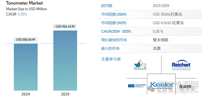 據(jù) Mordor Intelligence 數(shù)據(jù),眼壓計市場規(guī)模到 2024 年為 3.5656 億美元,預計到 2029 年將達到 4.5616 億美元,在預測期內(nèi)(2024-2029年)復合年增長率為 5.05%。
