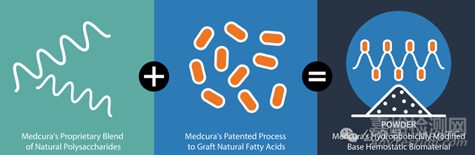 而Medcura通過(guò)技術(shù)創(chuàng)新,開(kāi)發(fā)一種疏水性的殼聚糖材料。同時(shí)加上脂肪酸和其他特性良好的惰性試劑最終形成一種新型自組裝止血材料,大幅度提升材料生物相容性、體內(nèi)異物反應(yīng)降到最小。