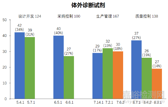 2023年度,上海市器審中心依據(jù)《醫(yī)療器械生產(chǎn)質(zhì)量管理規(guī)范》和《醫(yī)療器械生產(chǎn)質(zhì)量管理規(guī)范附錄體外診斷試劑》對體外診斷試劑企業(yè)依申請開展現(xiàn)場核查,合計(jì)發(fā)現(xiàn)不符合項(xiàng)共666項(xiàng)次。從不符合項(xiàng)在《規(guī)范》中各章節(jié)的分布情況來看,設(shè)計(jì)開發(fā)(124項(xiàng)次)、采購控制(100項(xiàng)次)、生產(chǎn)管理(167項(xiàng)次)、質(zhì)量控制(138項(xiàng)次)占比近八成。