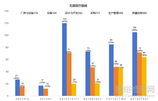 2023年度,本市無菌醫(yī)療器械現(xiàn)場核查合計發(fā)現(xiàn)缺陷1666項。廠房與設(shè)施(178項次)、設(shè)備(100項次)、設(shè)計開發(fā)(282項次)、采購(213項次)、生產(chǎn)管理(399項次)、質(zhì)量控制(360項次)占比超九成,下面將對這六個方面的關(guān)鍵風(fēng)險點及常見核查問題進(jìn)行梳理分析。