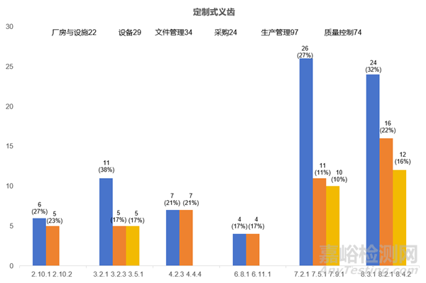 2023年度,本市定制式義齒現場核查合計發(fā)現缺陷409項。廠房與設施(22項次)、設備(29項次)、文件管理(34項次)、采購(24項次)、生產管理(97項次)、質量控制(74項次)占比超八成,下面將對這六個方面的關鍵風險點及常見核查問題進行梳理分析。