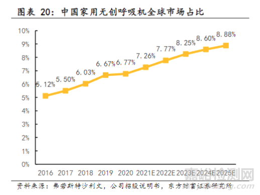 數(shù)據(jù)統(tǒng)計,2020 年后,受新冠肺炎疫情的影響,無創(chuàng)呼吸機市場增長明顯加速,根據(jù)弗若斯特沙利文的預(yù)測,2025 年全球家用無創(chuàng)呼吸機市場規(guī)模將達到 55.8 億美元,2020-2025 年 CAGR 高達 15.5%。
