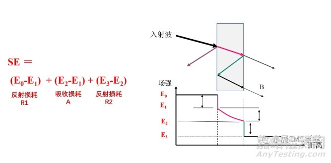 我們以電場(chǎng)為例說(shuō)明電磁波衰減的過(guò)程。圖中,如果入射電磁波的電場(chǎng)強(qiáng)度為E0,當(dāng)電磁波入射到屏蔽材料表面時(shí),由于傳輸介質(zhì)特性的突然變化,會(huì)發(fā)生反射,這會(huì)損失能量,這時(shí)電磁波中的電場(chǎng)強(qiáng)度降低為E1,電磁波在屏蔽材料中繼續(xù)傳播,由于屏蔽材料具有損耗,因此電場(chǎng)強(qiáng)度會(huì)不斷下降,當(dāng)?shù)竭_(dá)屏蔽材料的另一界面時(shí),幅度降低為E2,在這個(gè)界面,又會(huì)發(fā)生反射現(xiàn)象,使電場(chǎng)強(qiáng)度降低為E3,這部分電磁波就是屏蔽材料泄漏的部分。如果用dBV/m表示電場(chǎng)強(qiáng)度,(E1 - E3)就是屏蔽效能。