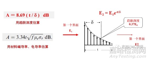 吸收損耗就是電磁波在屏蔽材料中傳播時(shí)的衰減程度。電磁波在介質(zhì)中傳播時(shí)的衰減特性如右上角的公式所示。這里的符號(hào)(代表趨膚深度,也就是高頻電流流過(guò)導(dǎo)體時(shí),趨膚效應(yīng)中對(duì)應(yīng)的趨膚深度,它對(duì)應(yīng)63%的電流所集中的表面深度。