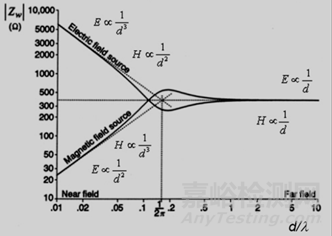 波阻抗是電磁波中的電場(chǎng)幅度與磁場(chǎng)幅度的比值。左圖是電場(chǎng)源(上邊的)和磁場(chǎng)源(下邊的)的波阻抗隨距離變化的情況。