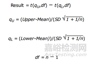 筆者解析:上述公式通過(guò)精密度結(jié)果推算準(zhǔn)確度在一定可接受標(biāo)準(zhǔn)下的置信度,以確定置信度是否在可接受的標(biāo)準(zhǔn)內(nèi),通常以0.95為可接受標(biāo)準(zhǔn),即95%的置信水平。這個(gè)公式也可以做變形轉(zhuǎn)化,反過(guò)來(lái)計(jì)算95%置信水平下的準(zhǔn)確度的置信區(qū)間,這時(shí)的可接受標(biāo)準(zhǔn)就是通常所見的 Lower~Upper。變換后公式如下: