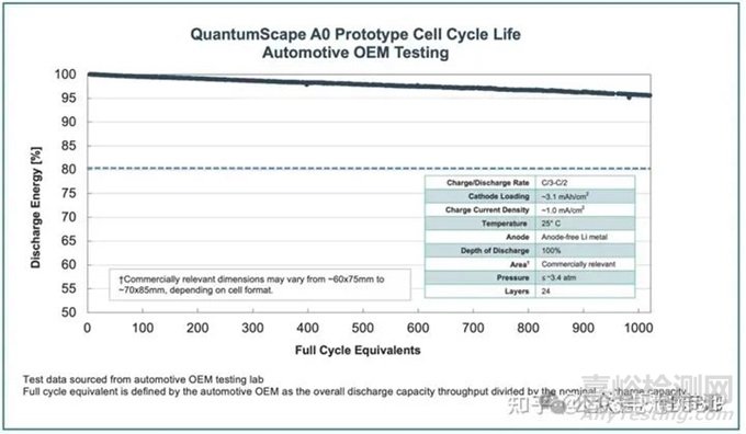 整車(chē)客戶(hù)測(cè)試的結(jié)果 測(cè)試數(shù)據(jù)由某知名整車(chē)廠(chǎng)提供,測(cè)試電池為前期所提到的A0原型電池,電池為24層,按照Quantum Scape公司的定義,24層電池實(shí)際應(yīng)該對(duì)應(yīng)的是12層雙面正極+13層負(fù)極,電池正極面容量3.1mAh/cm2,電池容量大約為3.6Ah。該整車(chē)廠(chǎng)的循環(huán)制度按照C/3充電,C/2放電,進(jìn)行100%SOC循環(huán),該充放電制度較Quantum Scape公司自測(cè)1C/1C制度稍緩和一些,測(cè)試溫度為室溫,測(cè)試壓力為3.4個(gè)標(biāo)準(zhǔn)大氣壓。當(dāng)前電池循環(huán)1000周,能量保持率達(dá)到95%以上,這個(gè)數(shù)據(jù)優(yōu)于Quantum Scape公司自測(cè)的結(jié)果,應(yīng)該是由于充放電倍率小的緣故。對(duì)于這一結(jié)果,從報(bào)告中可以知道Quantum Scape公司也很意外。