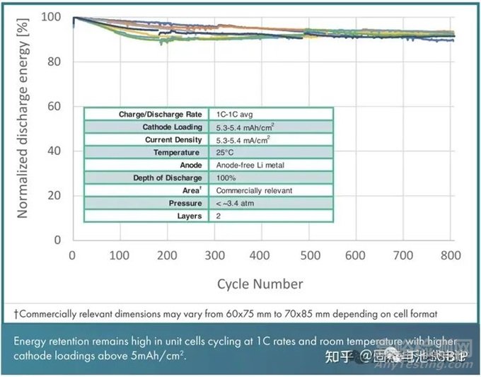 電池目前循環(huán)了800周,盡管電池循環(huán)過(guò)程的一致性較差,但是測(cè)試的幾只電池能量保持率都在90%以上,對(duì)比800周的能量保持率,這種由高面容量電極組裝成的電池與前期Quantum Scape公司公開(kāi)的3.1-3.4mAh/cm2面容量電池相近,這樣就會(huì)得出一個(gè)初步的結(jié)論:增加至目標(biāo)面容量5mAh/cm2對(duì)于全固態(tài)電池的循環(huán)性能并沒(méi)有顯著的影響。