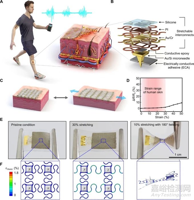 圖1 SNAP 的設(shè)計和工作理念。( A ) SNAP 的整體系統(tǒng)配置和應(yīng)用示意圖。該貼片式設(shè)備集成了皮膚適形SNAP,無論皮膚狀況如何,都能夠進行可靠、長期的 EP 信號監(jiān)測。插圖顯示了柔軟的組織適應(yīng)型 SNAP 的特寫視圖,該 SNAP 使用微針穿透角質(zhì)層以直接進入表皮。 ( B ) SNAP 的分解示意圖,由可拉伸蛇形互連、鍍金硅微針和由銀片-硅復(fù)合材料制成的導(dǎo)電粘合劑組成。 ( C ) SNAP 的示意圖,突出顯示其適應(yīng)組織拉伸的能力。 ( D ) SNAP 的相對電阻變化作為拉伸應(yīng)變的函數(shù)。當(dāng) SNAP 受到 30% 拉伸時,其電阻變化可以忽略不計,這對應(yīng)于人體皮膚的最大拉伸范圍 (8 .49)。這凸顯了其在拉伸變形下保持穩(wěn)定電測量的能力。 ( E ) 光學(xué)圖像顯示 SNAP 的高機械順應(yīng)性:(左)原始狀態(tài);(中)30% 拉伸;(右)180° 扭轉(zhuǎn) 10% 拉伸。 ( F ) SNAP 的有限元建模,其變形配置對應(yīng)于 (E) 中所示的配置。