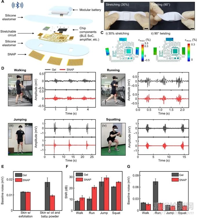 圖2 無線SNAP系統(tǒng)在各種步行運動期間的肌電圖監(jiān)測性能 ( A ) 無線 SNAP 系統(tǒng)的分解示意圖。該無線系統(tǒng)由 SNAP、用于無線 EP 記錄的可拉伸電路、封裝有柔軟、生物相容性彈性體的可拆卸鋰電池組成。( B ) 在拉伸(ε = 30%;i)和扭轉(zhuǎn)(90° 扭轉(zhuǎn);ii)過程中拍攝的設(shè)備照片。( C ) 對應(yīng)于 (B) 的變形情況下的裝置的有限元模擬結(jié)果。( D ) 顯示不同類型的動態(tài)運動及其相應(yīng)的 EMG 記錄的圖像,使用與凝膠電極(灰色圖)和 SNAP(紅色圖)集成的貼片型設(shè)備進行記錄。人類受試者執(zhí)行四種類型的步行運動:(i)行走、(ii)跑步、(iii)跳躍和(iv)蹲下,目標(biāo)肌肉是股內(nèi)側(cè)肌。( E到G )記錄的EMG信號質(zhì)量圖,包括預(yù)處理和污染皮膚狀況 (E) 的基線噪聲幅度、信噪比 (F) 和四種動態(tài)運動的基線噪聲幅度 (G)。