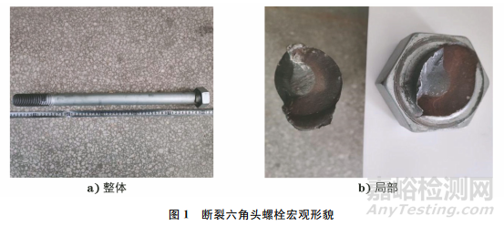 高強(qiáng)度螺栓是現(xiàn)代工業(yè)不可缺少的基礎(chǔ)性零件,螺栓斷裂往往導(dǎo)致十分嚴(yán)重的后果,所以對斷裂螺栓進(jìn)行深入分析,發(fā)現(xiàn)其中潛在的危險(xiǎn)因素,是保證產(chǎn)品可靠性和穩(wěn)定性的有效手段。42CrMoA鋼是磷元素和硫元素含量較低的高級優(yōu)質(zhì)鋼,具有良好的綜合性能,常用于制造高強(qiáng)度螺栓。在安裝與緊固某公司生產(chǎn)的六角頭螺栓時(shí),螺栓頭下圓角處發(fā)生斷裂,該螺栓材料為42CrMoA鋼,制造工藝為:鋸料→平兩端→車坯徑→烘打→頭部倒角→調(diào)質(zhì)(按10.9級,淬火溫度為820℃,加熱時(shí)間為100min,回火溫度為560℃,回火時(shí)間為170min)→校直→滾絲→無損檢測→噴涂(主要為鋅鋁鉻涂層)→檢驗(yàn)包裝。研究人員采用一系列理化檢驗(yàn)方法分析該六角頭螺栓斷裂的原因,以防止該類問題再次發(fā)生。
