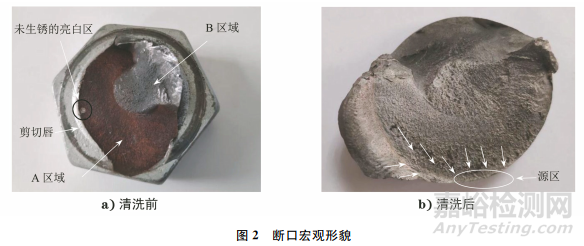 觀察六角頭螺栓斷口,發(fā)現(xiàn)斷裂發(fā)生在螺栓頭下圓角處,斷裂六角頭螺栓宏觀形貌如圖1所示。整個(gè)斷面分為2個(gè)區(qū)域:A區(qū)域和B區(qū)域(見圖2)。由圖2可知:A區(qū)域覆蓋有一層較厚的銹漬,約占整個(gè)斷面的2/3,該區(qū)域還存在一處未生銹的亮白區(qū),亮白區(qū)相對周邊稍有凹陷且緊靠螺栓頭部圓角處,最深處距離圓角邊緣約2.0mm[見圖2a)];將銹漬清洗后發(fā)現(xiàn),原生銹部分?jǐn)嗫谳^為平整,具有脆性斷口的特征,斷口人字紋向表面匯聚,該處為發(fā)生斷裂的裂紋源區(qū)[見圖2b)];B區(qū)域斷口新鮮,為安裝時(shí)瞬時(shí)斷裂形成,斷口邊緣具有明顯的塑性變形和金屬光澤的剪切唇。
